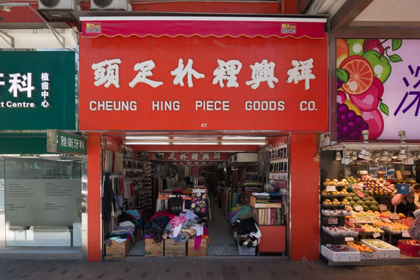 Founded in 1971, Cheung Hing is one of the long-standing fabric shops in Sham Shui Po specialising in linings and interlinings. According to Mr. Yuen, the second-generation manager, the shop’s deep, layered signboard was designed by his father to guide customers gradually into the space.